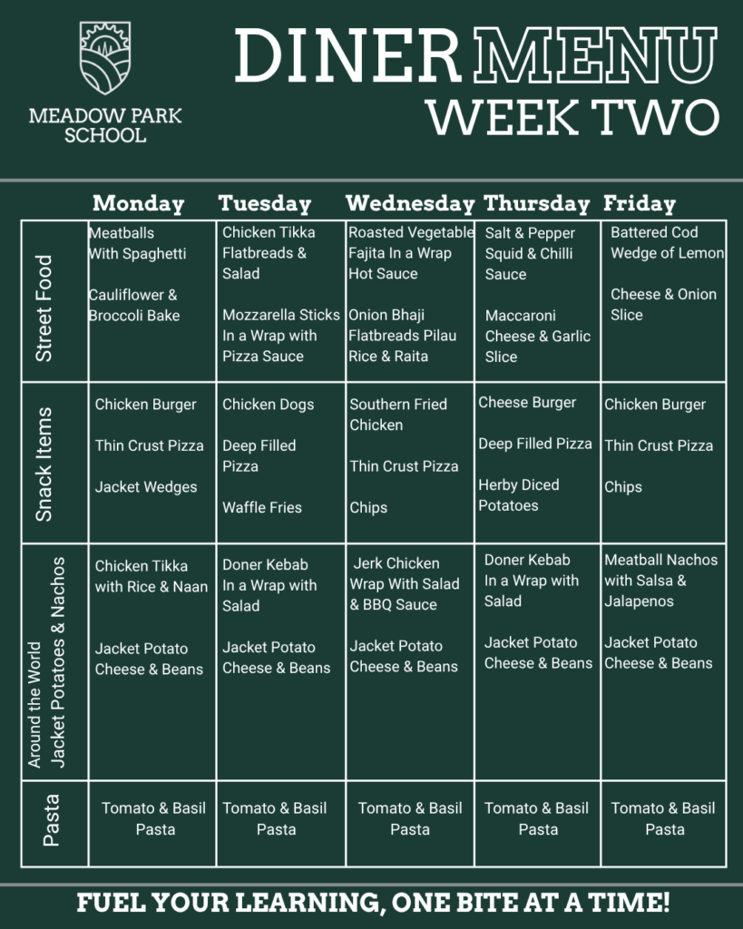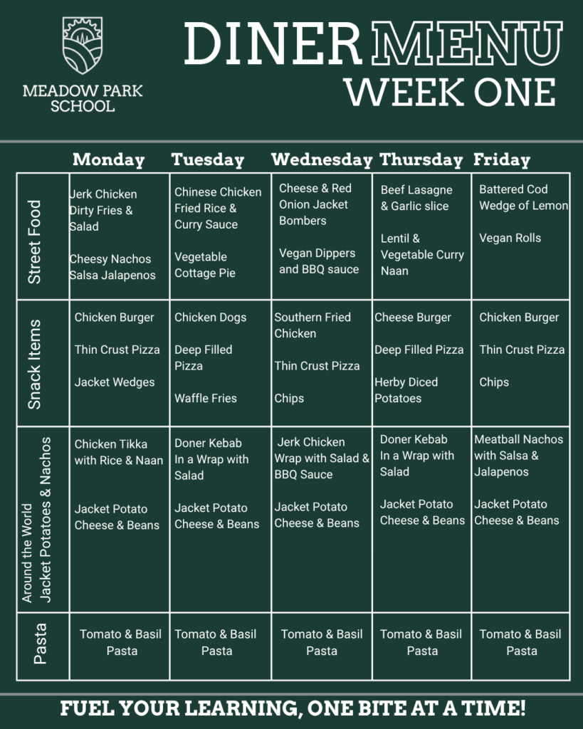 This term’s menu options in The Lakeside Diner can be found below. If you have any questions about our school dinners, please contact the school office.
