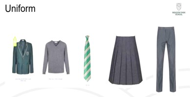 | School uniform (branded) – Green blazer with Meadow Park School logo – Green and grey tie, with contrast House colour stripe | PE Kit: – Plain black polo shirt – Plain black shorts – Plain black leggings (opaque) – Plain black socks |